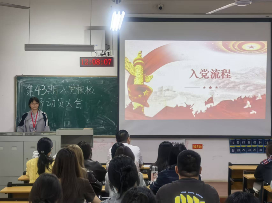 10 月 17 日,文法学院党总支于 2218 教室召开第 43 期入党积极分子培训动员大会,学生第二党支部书记欧阳嘉斌出席,全体本期入党积极分子、24 及 25 级学生助理参会,会议由学生助理郭新兰主持。